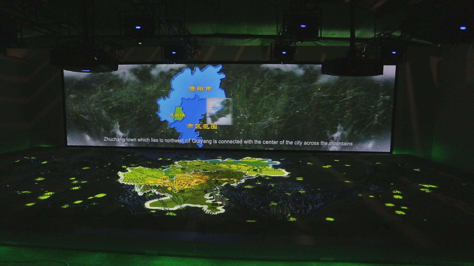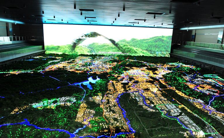 在空間、信息和觸控三屏的聯動下的沙盤。由空間屏的三維場景,準確的把現實世界里的所有展現出來,例如可以任意的查詢地理信息、任意的去調整角度進行瀏覽、根據需要來添加備注等。